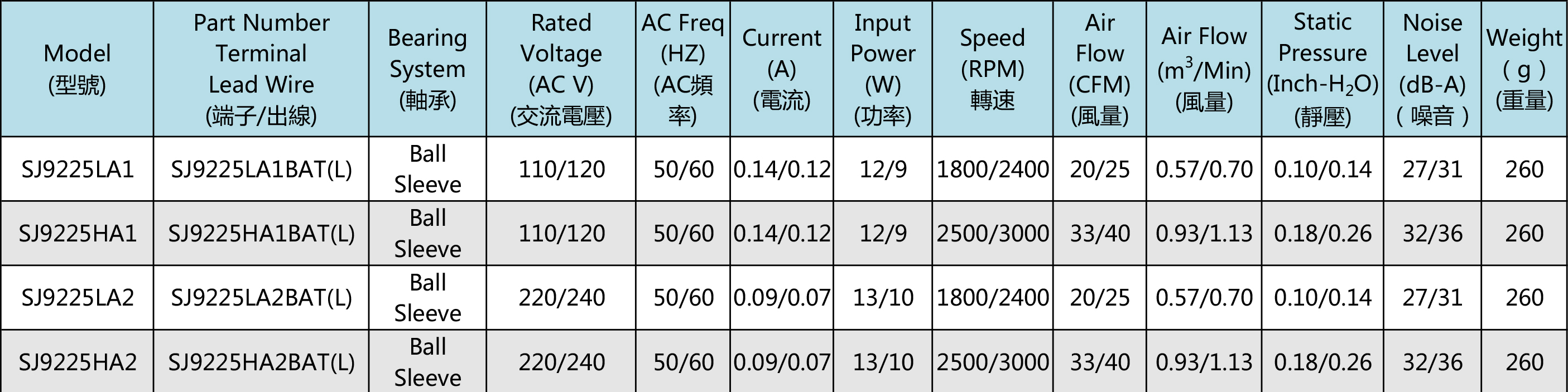 框架:鋁ADC-12 軸承:含油軸承&雙滾珠軸承 電壓:AC 110V 220V 380V 壽命:60 000Hours at 20℃--滾珠軸承 30 000Hours at 20℃--含油軸承 工作溫度:-20℃~85℃ 正常濕度 儲存溫度:-30℃~140℃ 正常濕度